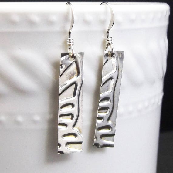 These cute dangling silver rectangular earrings measure 0.25 inches in width and 1.5 inches in length. Each earring is handmade by me in my North Carolina Studio using a metal embossing technique that creates the shapes and patterns seen on these earrings.