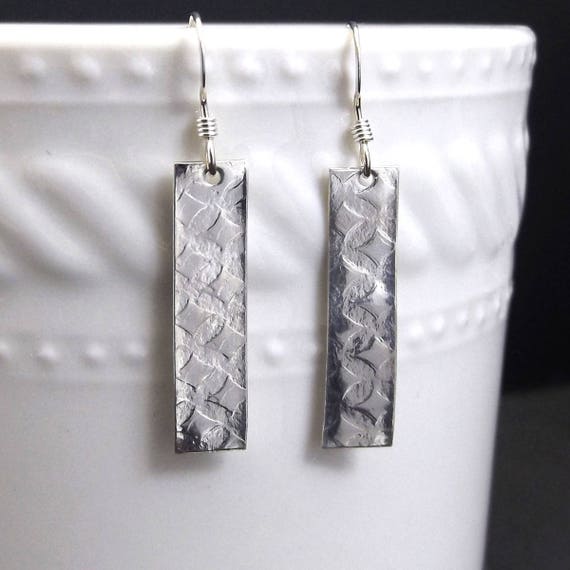 These cute dangling silver rectangular earrings measure 0.25 inches in width and 1.5 inches in length. Each earring is handmade by me in my North Carolina Studio using a metal embossing technique that creates the shapes and patterns seen on these earrings.