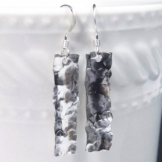 This textured pair of dangle earrings has been hammered into a unique pattern that certainly leaves an impact, both on the wearer and anyone who catches a glimpse. The handcrafted sterling silver rectangle pendants have been repeatedly struck to create the rough and disarrayed pattern, and you’re sure to be the only one of your friends with a set.