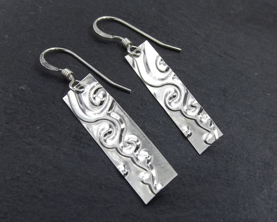These silver earrings includes a sterling silver rectangle that is embossed with a spiral cloud design. They are beautifully lightweight, and will not pull on your ears!