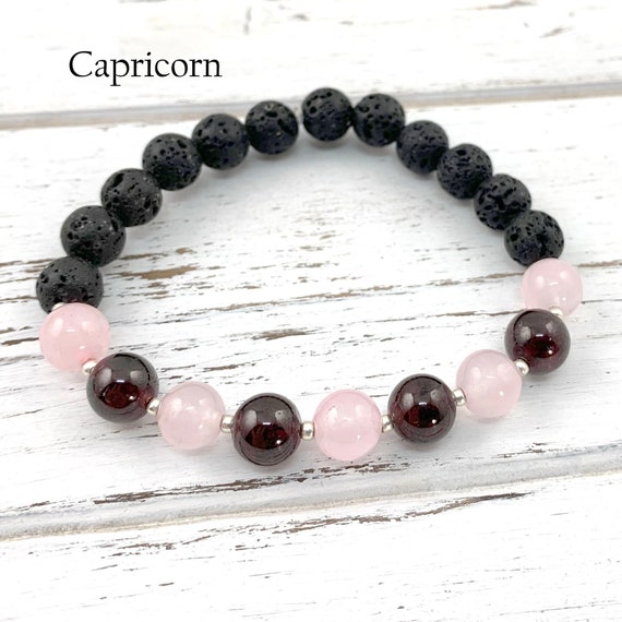 Eluna Jewelry's Capricorn Zodiac Bracelet is handmade featuring Rose Quartz and Garnet beads, and finished off with black lava beads. The bracelet is a stretch bracelet measuring approximately 7.5 inches.